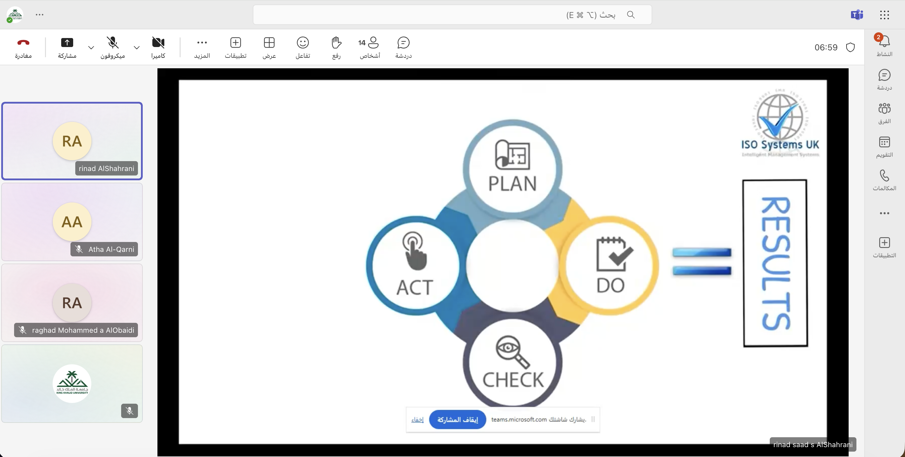 حيث جرى خلالها شرح مفهوم نظام إدارة الجودة (ISO) وعلاقته بمجال الأمن السيبراني، إضافةً إلى توضيح أهمية تطبيق معايير الجودة في تعزيز كفاءة الأداء وحماية المعلومات.