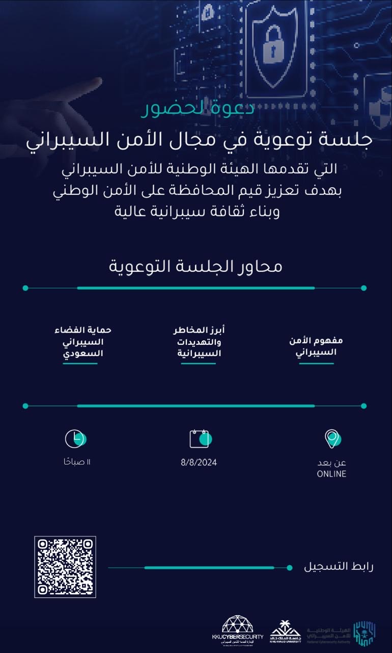 في إطار جهود تعزيز الوعي بالأمن السيبراني، قدّمت الهيئة الوطنية للأمن السيبراني جلسة توعوية بالتعاون مع الإدارة العامة للأمن السيبراني بجامعة الملك خالد، وذلك يوم الخميس الموافق 8 أغسطس 2024م.
